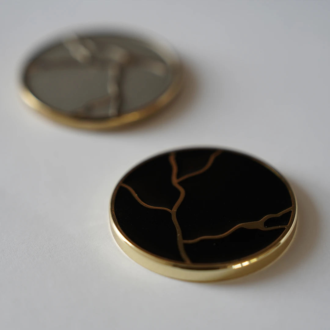 On the other, cracks filled with gold — inspired by kintsugi, the Japanese art of restoring what’s broken with gold, showing that imperfection can become strength.